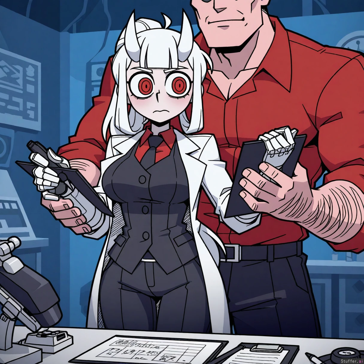 Best quality, amazing quality, absurd res, masterpiece, vanripper, 1girl, Loremaster \(helltaker\), laboratory background, white coat, holding clipboard and pen, standing, writing on clipboard 1boy, subject 67 (helltaker), muscular male, behind female, beside female, bigger than female