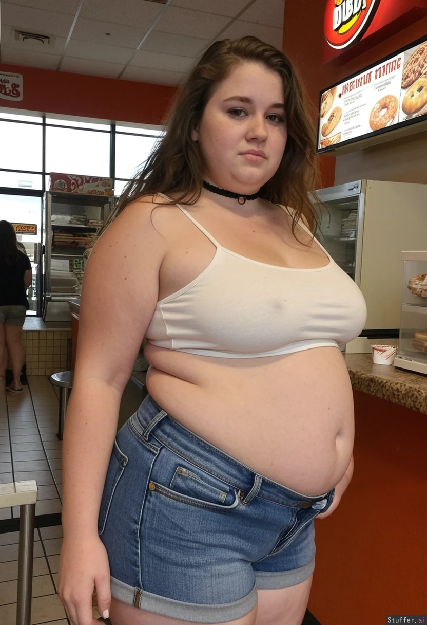 25 year old overfed local bumpkin chick, brunette, post pregnancy weight, round bloated face, ugly, unkempt, double chin, messy unwashed long flowing hair, front view slightly side on. She is extra short in height. She is wearing a tight choker, stretchy white backstrapped crop top tucked into her oversized ill-fitting denim shorts as she is just chubby enough to overfill her clothes. Her level of obesity is on the verge of giving her diabetes. Blob gut. Standing in a fast food restaurant scoffing donuts.