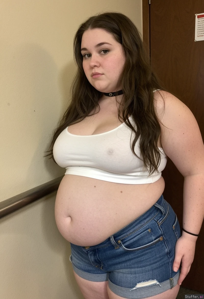 25 year old overfed local bumpkin chick, brunette, post pregnancy weight, round bloated face, ugly, unkempt, double chin, messy unwashed long flowing hair, front view slightly side on. She is extra short in height. She is wearing a tight choker, stretchy white backstrapped crop top tucked into her oversized ill-fitting denim shorts as she is just chubby enough to overfill her clothes. Her level of obesity is on the verge of giving her diabetes. Blob gut. Spending all day every day in a fast food restaurant scoffing donuts.