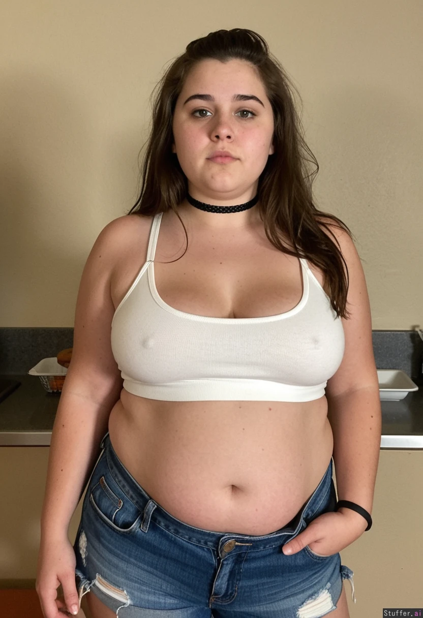 25 year old overfed local bumpkin chick, brunette, post pregnancy weight, round bloated face, ugly, unkempt, double chin, messy unwashed long flowing hair, front view slightly side on. She is extra short in height. She is wearing a tight choker, stretchy white backstrapped crop top tucked into her oversized ill-fitting denim shorts as she is just chubby enough to overfill her clothes. Her level of obesity is on the verge of giving her diabetes. Blob gut. Spending all day every day in a fast food restaurant stuffing donuts down her throat.