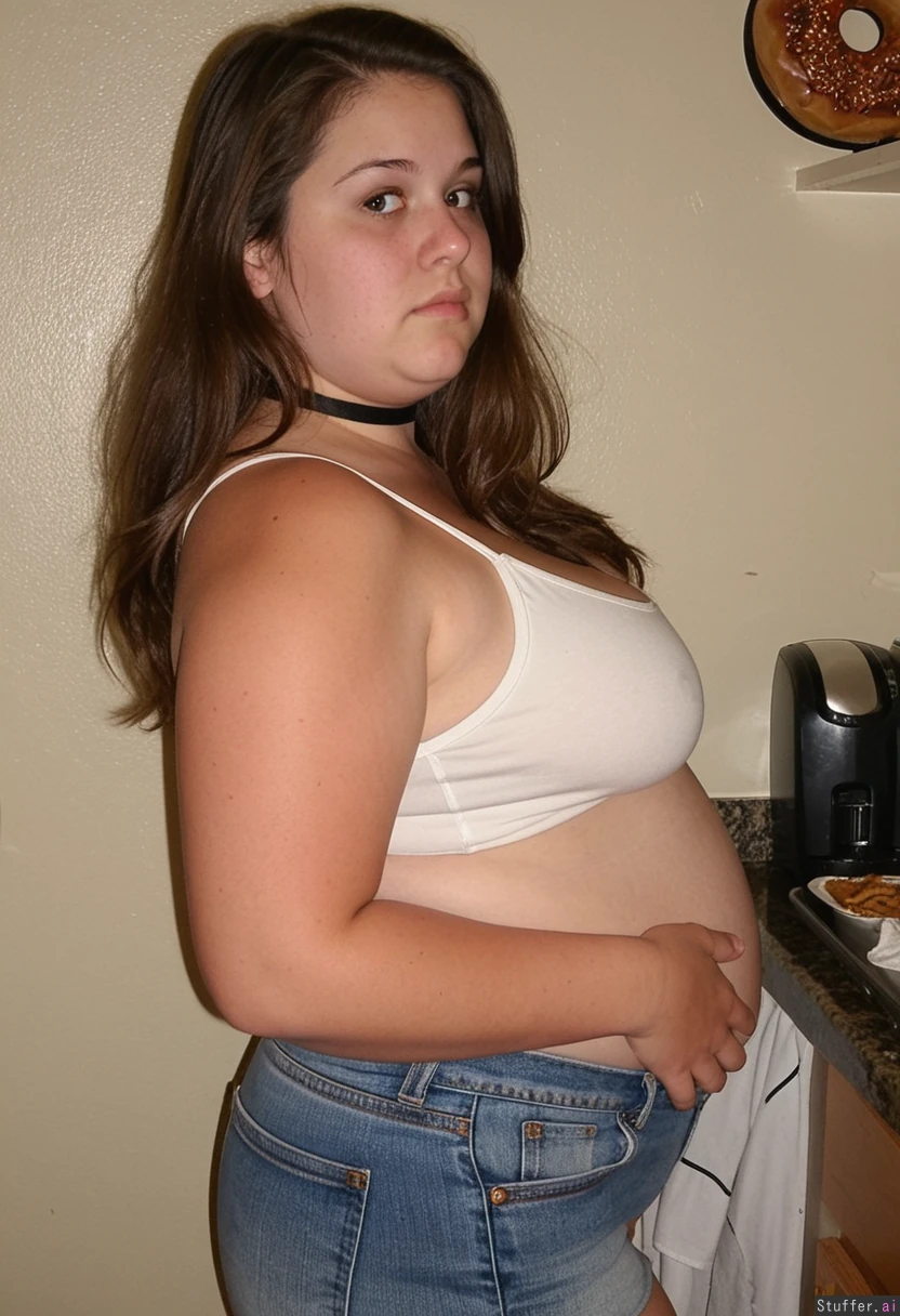 25 year old overfed local bumpkin chick, brunette, post pregnancy weight, round bloated face, ugly, unkempt, double chin, messy unwashed long flowing hair, front view slightly side on. She is extra short in height. She is wearing a tight choker, stretchy white backstrapped crop top tucked into her oversized ill-fitting denim shorts as she is just chubby enough to overfill her clothes. Her level of obesity is on the verge of giving her diabetes & she doesn't care. Blob gut. Spending all day every day in a fast food restaurant stuffing donuts down her throat.