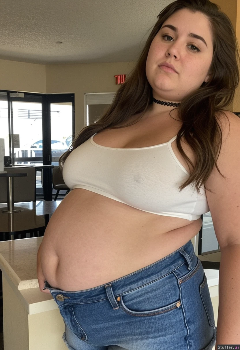 25 year old overfed local bumpkin chick, brunette, post pregnancy weight, round bloated face, ugly, unkempt, double chin, messy unwashed long flowing hair, front view slightly side on. She is extra short in height. She is wearing a tight choker, stretchy white backstrapped crop top tucked into her oversized ill-fitting denim shorts as she is just chubby enough to overfill her clothes. Her level of obesity is on the verge of giving her diabetes & she doesn't care. Blob gut. Spending all day every day in a fast food restaurant stuffing donuts down her throat.