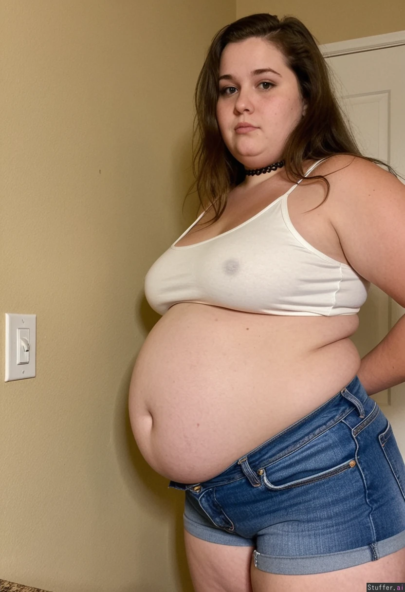 25 year old overfed local bumpkin chick, brunette, post pregnancy weight, round bloated face, ugly, unkempt, double chin, messy unwashed long flowing hair, front view slightly side on. She is extra short in height. She is wearing a tight choker, stretchy white backstrapped crop top tucked into her oversized ill-fitting denim shorts as she is just chubby enough to overfill her clothes. Her level of obesity is on the verge of giving her diabetes & she doesn't care. Blob gut. Spending all day every day in a fast food restaurant stuffing donuts down her throat.