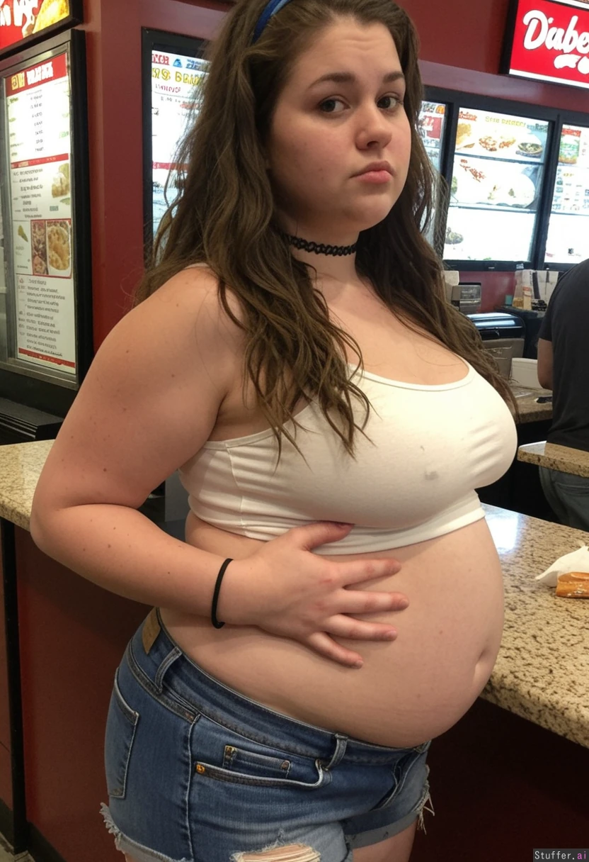 25 year old overfed local bumpkin chick, brunette, post pregnancy weight, round bloated face, ugly, unkempt, double chin, messy unwashed long flowing hair, front view slightly side on. She is extra short in height. She is wearing a tight choker, stretchy white backstrapped crop top tucked into her oversized ill-fitting denim shorts as she is just chubby enough to overfill her clothes. Her level of obesity is on the verge of giving her diabetes & she doesn't care. Blob gut. Standing at the front counter of a fast food restaurant with a packed belly ordering another meal.