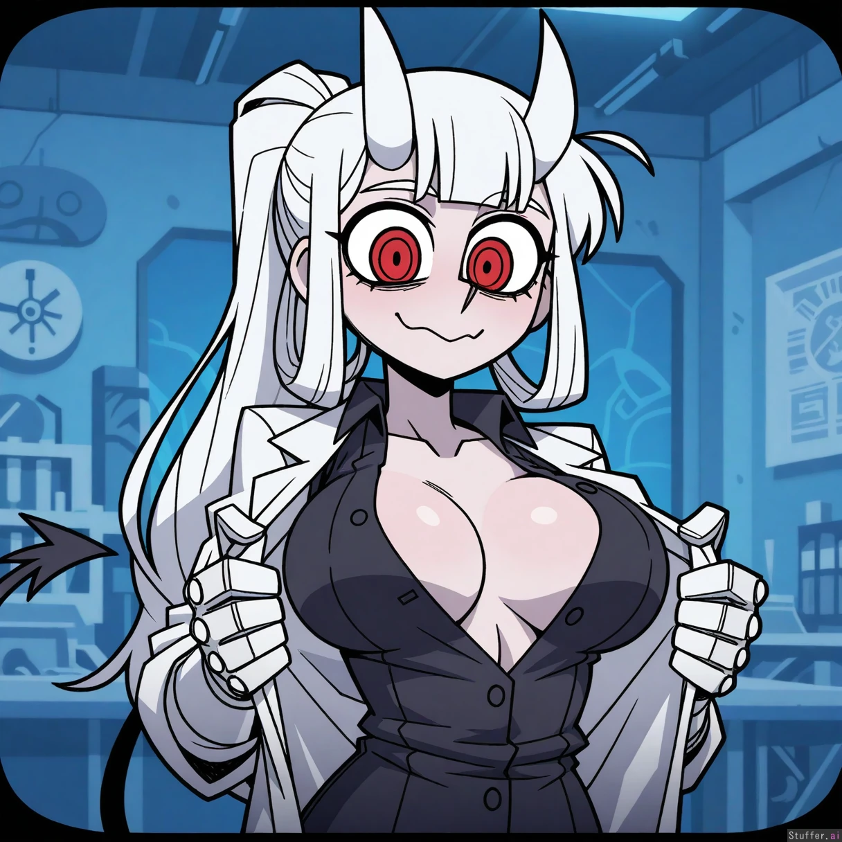Best quality, amazing quality, absurd res, masterpiece, vanripper, 1girl, Loremaster \(helltaker\), laboratory background, white coat, opening shirt