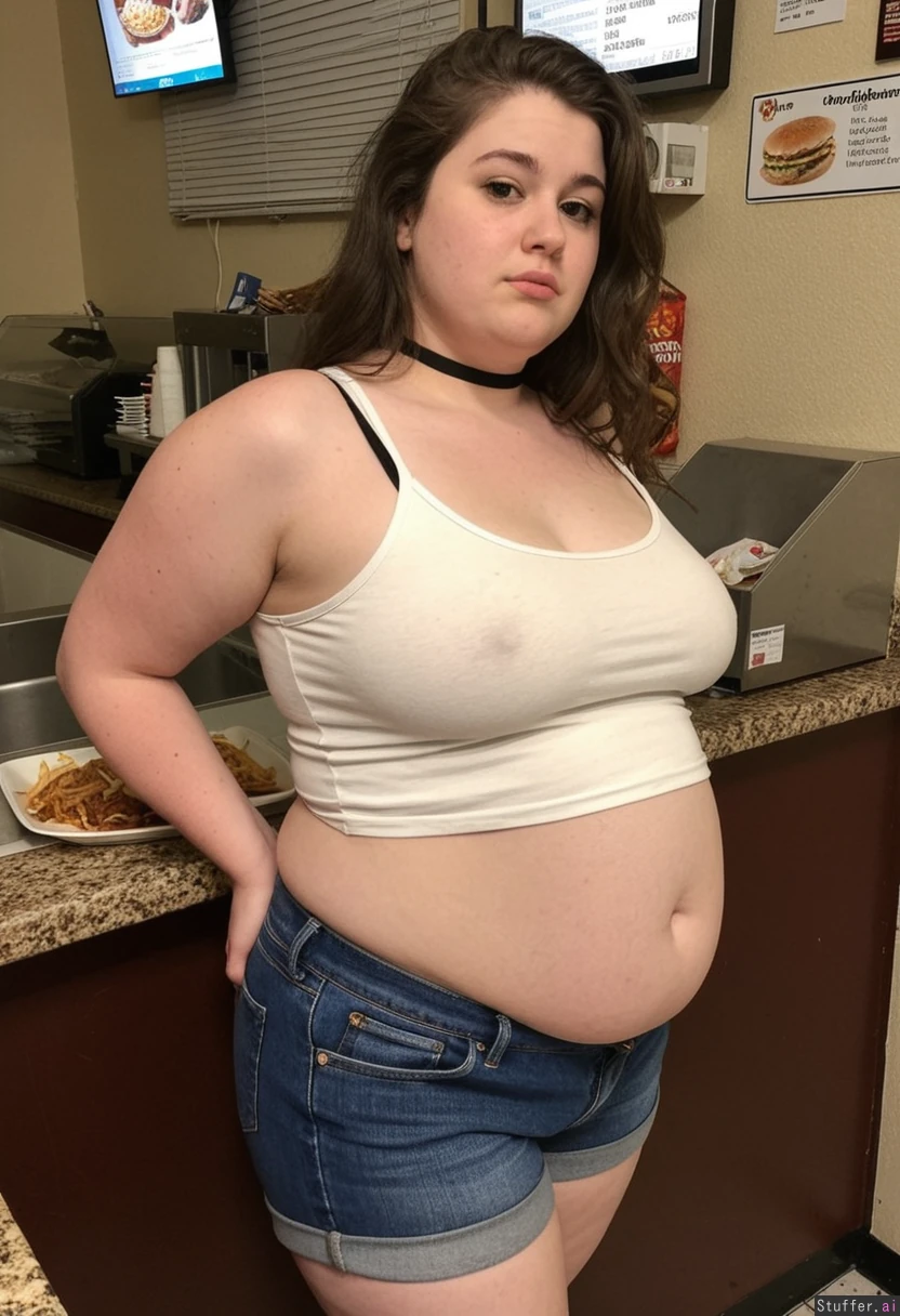 25 year old overfed local bumpkin chick, brunette, post pregnancy weight, round bloated face, ugly, unkempt, double chin, messy unwashed long flowing hair, front view slightly side on. She is extra short in height. She is wearing a tight choker, stretchy white backstrapped crop top tucked into her oversized ill-fitting denim shorts as she is just chubby enough to overfill her clothes. Her level of obesity is on the verge of giving her diabetes & she doesn't care. Blob gut. Standing at the front counter of a fast food restaurant with a packed belly ordering another meal.