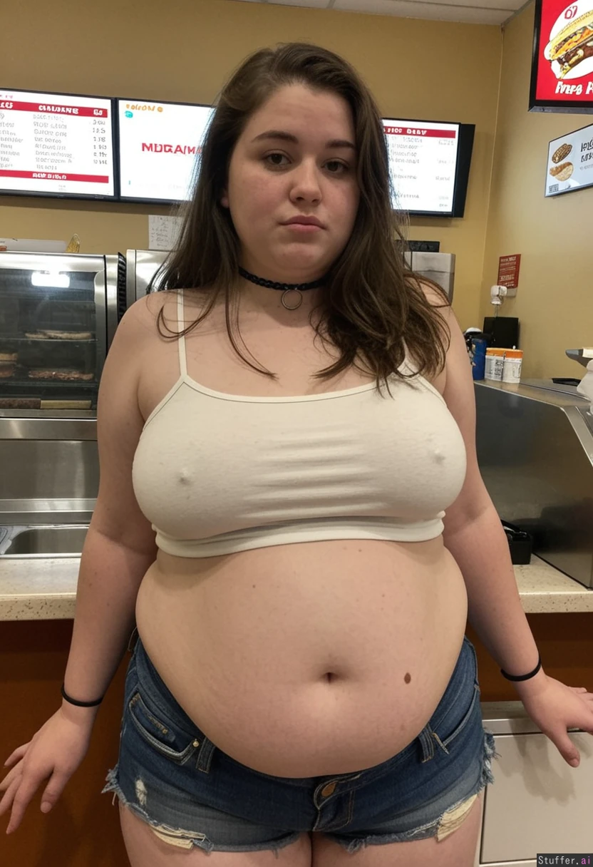 25 year old overfed local bumpkin chick, brunette, post pregnancy weight, round bloated face, ugly, unkempt, double chin, messy unwashed long flowing hair, front view slightly side on. She is extra short in height. She is wearing a tight choker, stretchy white backstrapped crop top tucked into her oversized ill-fitting denim shorts as she is just chubby enough to overfill her clothes. Her level of obesity is on the verge of giving her diabetes & she doesn't care. Blob gut. Standing at the front counter of a fast food restaurant with a packed belly ordering another meal.