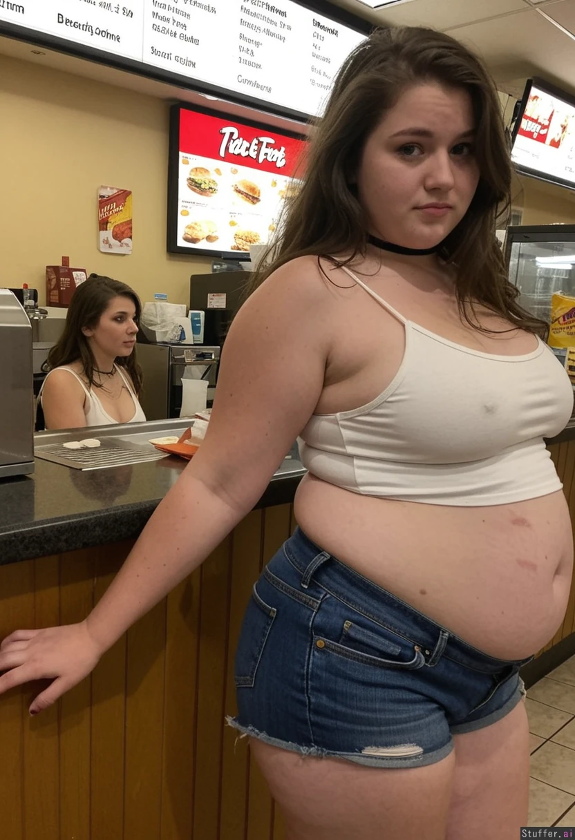 25 year old overfed local bumpkin chick, brunette, post pregnancy weight, round bloated face, ugly, unkempt, double chin, messy unwashed long flowing hair, front view slightly side on. She is extra short in height. She is wearing a tight choker, stretchy white backstrapped crop top tucked into her oversized ill-fitting denim shorts as she is just chubby enough to overfill her clothes. Her level of obesity is on the verge of giving her diabetes & she doesn't care. Blob gut. Standing at the front counter of a fast food restaurant with a packed belly ordering another meal.