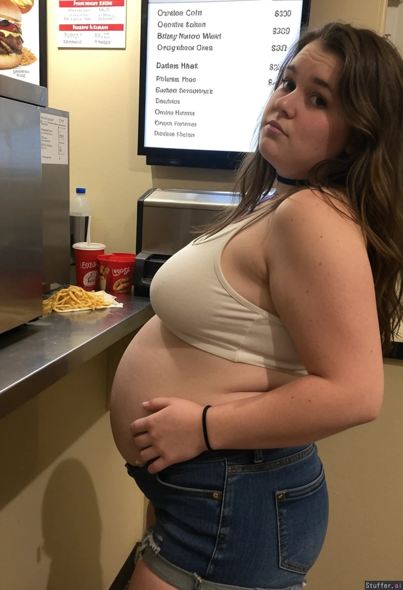 25 year old overfed local bumpkin chick, brunette, post pregnancy weight, round bloated face, ugly, unkempt, double chin, messy unwashed long flowing hair, front view slightly side on. She is extra short in height. She is wearing a tight choker, stretchy white backstrapped crop top tucked into her oversized ill-fitting denim shorts as she is just chubby enough to overfill her clothes. Her level of obesity is on the verge of giving her diabetes & she doesn't care. Blob gut. Standing at the front counter of a fast food restaurant with a packed belly ordering another meal.