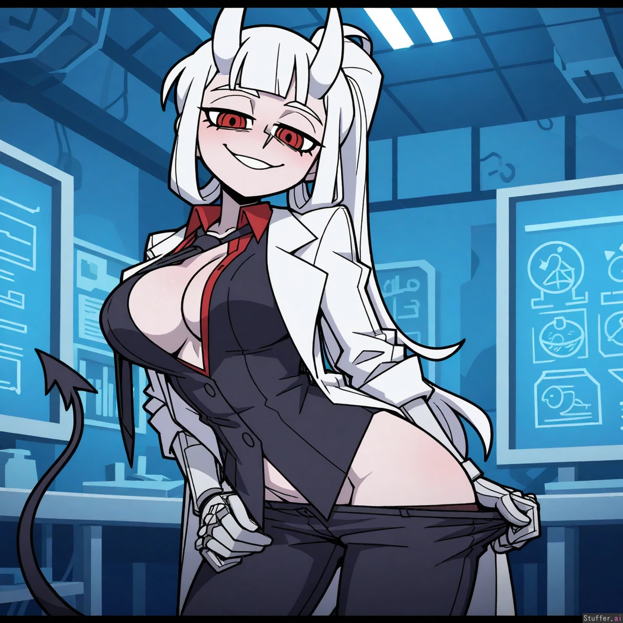 Best quality, amazing quality, absurd res, masterpiece, vanripper, 1girl, Loremaster \(helltaker\), laboratory background, white coat, seductive smile, standing, opened shirt showing breasts, pulling down pants