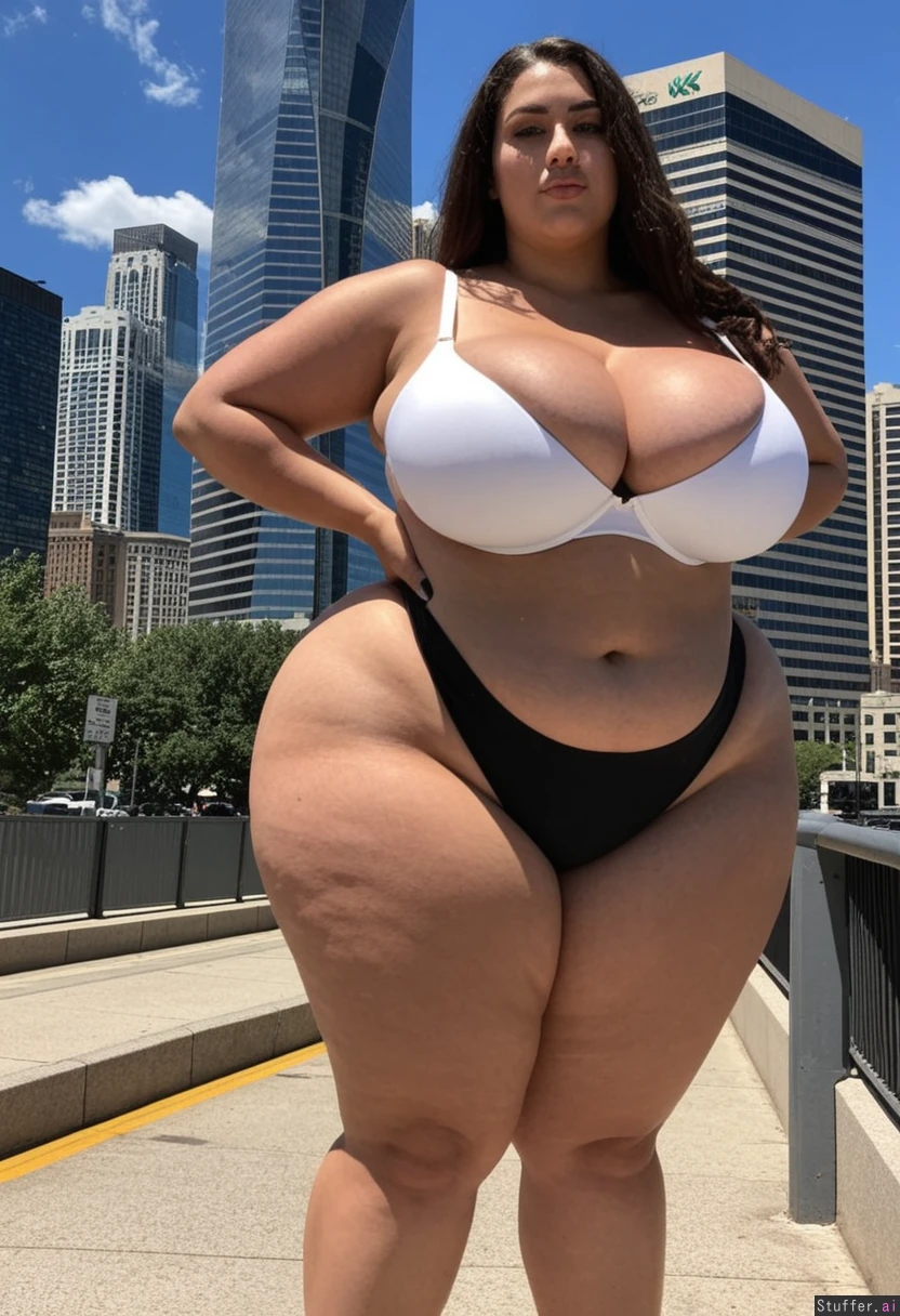 Tall tan woman with curvy body Wearing tight black thong Wearing white bra cleavage showing Long brown hair Black high heels ((High definition 4k)) Standing outside in a city on sunny day (((Massive breasts cleavage showing))) ((((Enormous wide curvy hips)))) ((((Gigantic wide curvy hips)))) (((Skinny waist)))