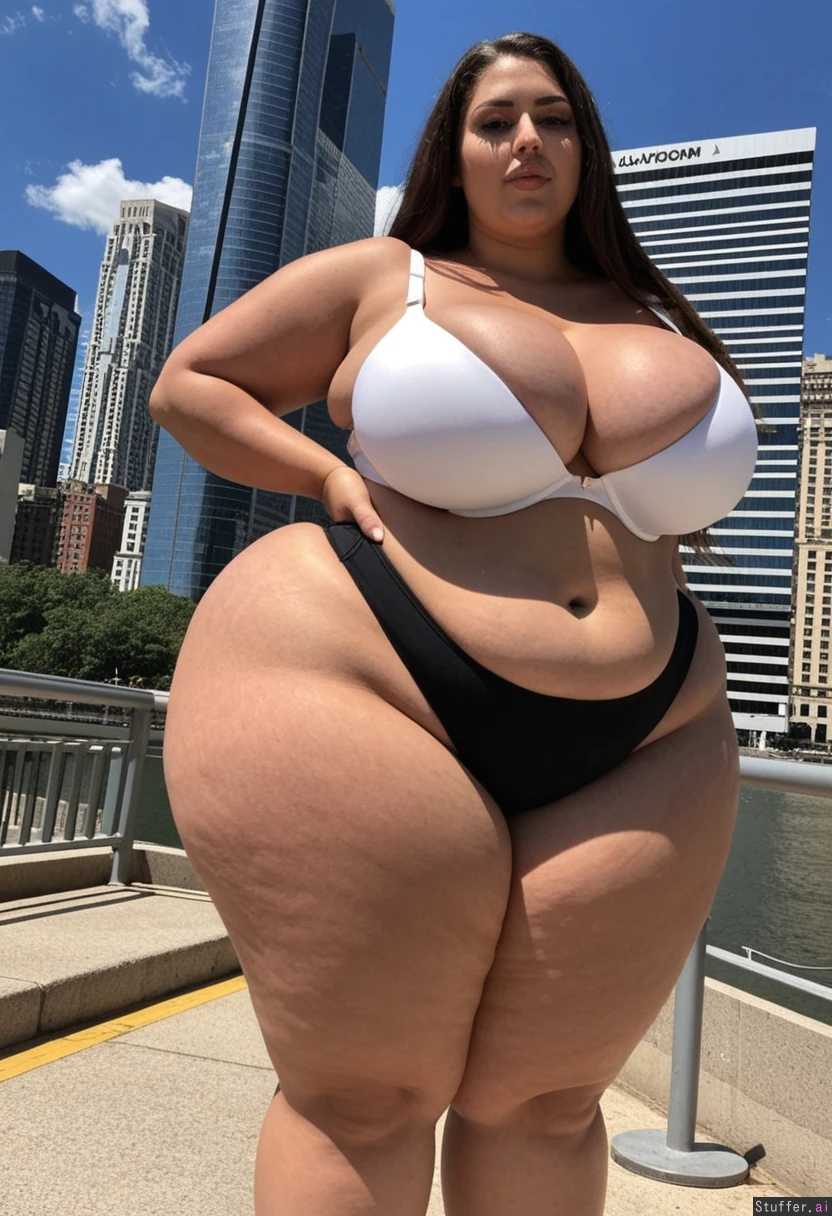 Tall tan woman with curvy body Wearing tight black thong Wearing white bra cleavage showing Long brown hair Black high heels ((High definition 4k)) Standing outside in a city on sunny day (((Massive breasts cleavage showing))) ((((Enormous wide curvy hips)))) ((((Gigantic wide curvy hips)))) (Skinny waist)