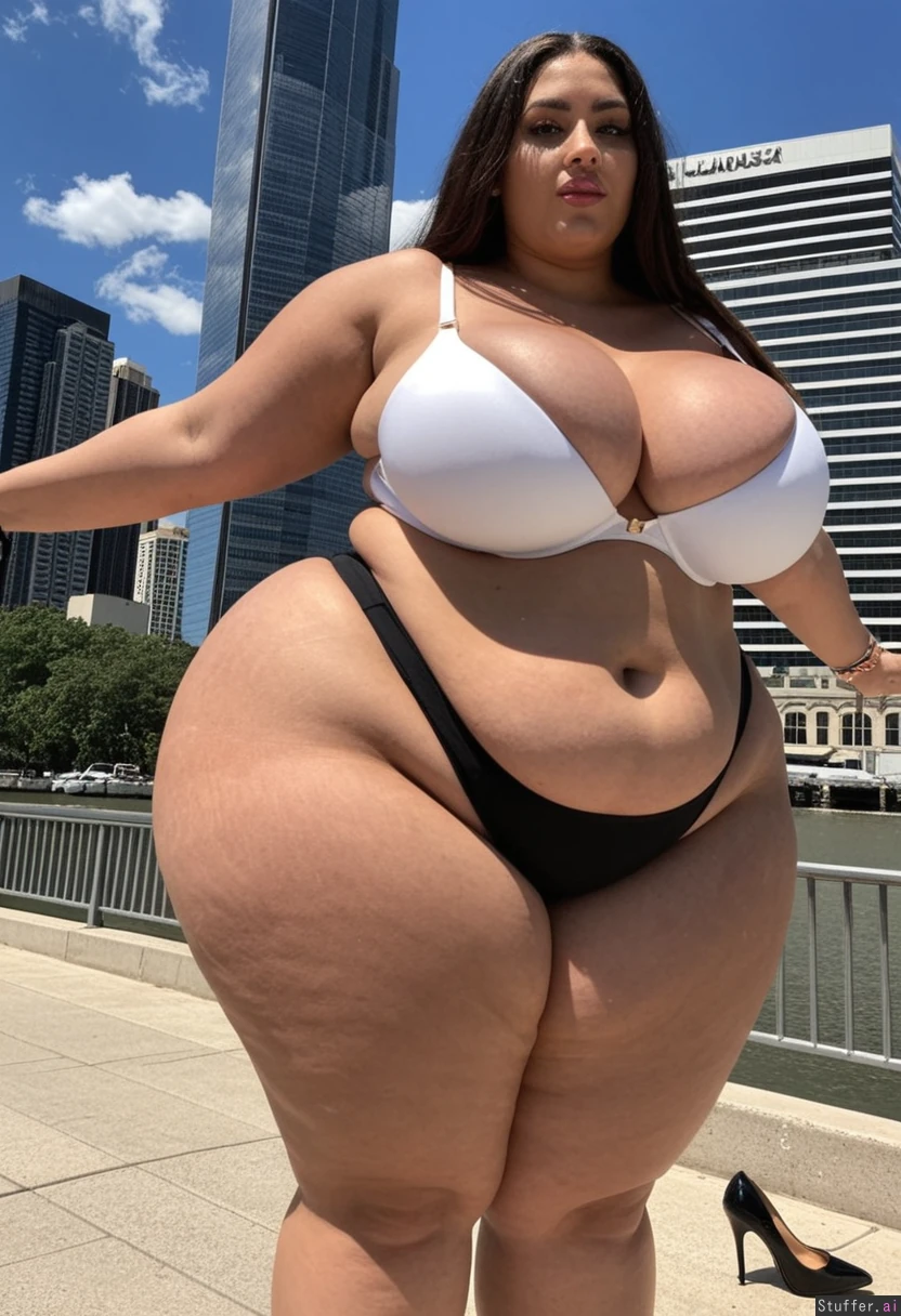 Tall tan woman with curvy body Wearing tight black thong Wearing white bra cleavage showing Long brown hair Black high heels ((High definition 4k)) Standing outside in a city on sunny day (((Massive breasts cleavage showing))) ((((Enormous wide curvy hips)))) ((((Gigantic wide curvy hips))))
