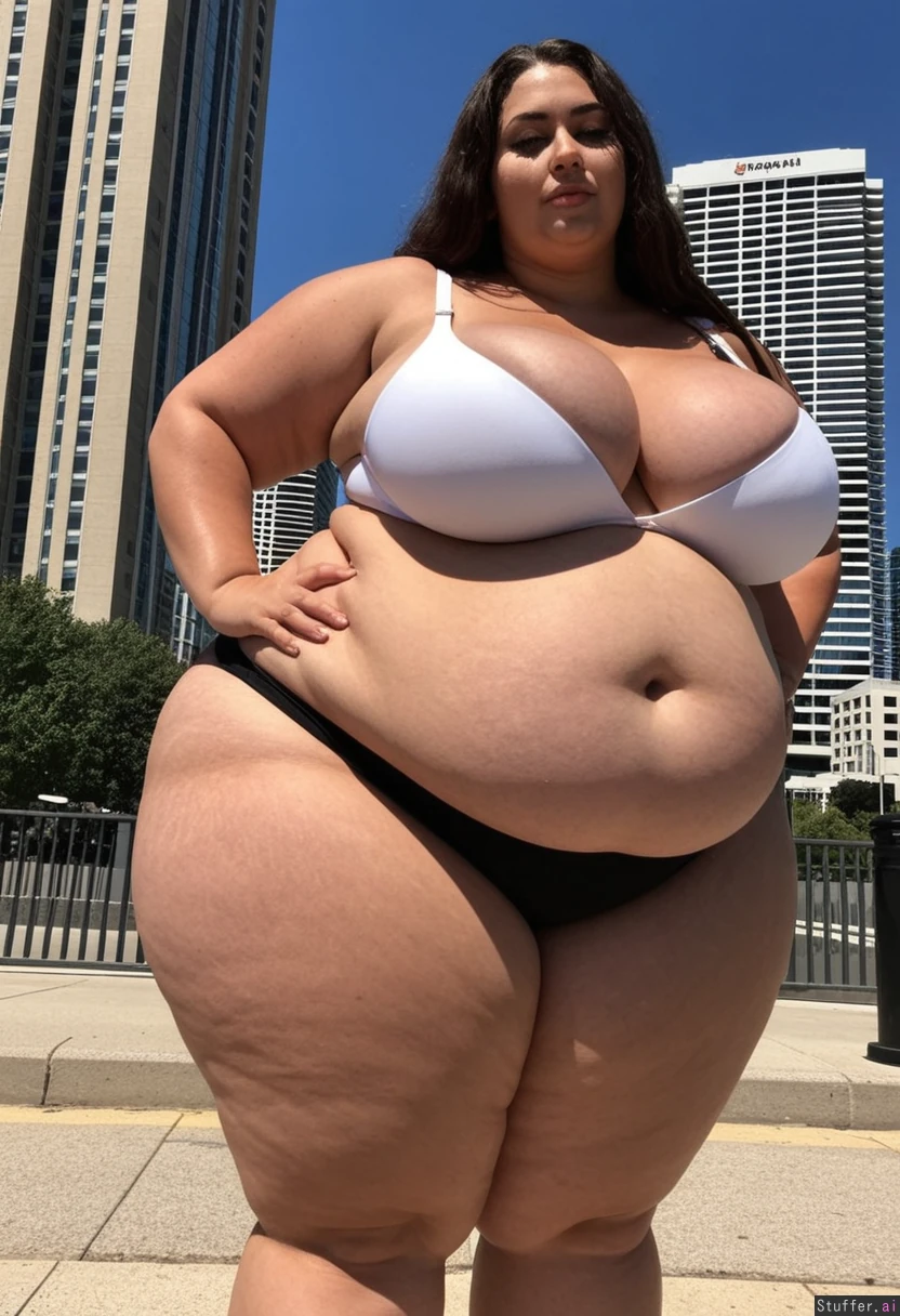 Tall tan woman with curvy body Wearing tight black thong Wearing white bra cleavage showing Long brown hair Black high heels ((High definition 4k)) Standing outside in a city on sunny day ((((Massive breasts cleavage showing)))) (((((Enormous wide curvy hips))))) (((((Gigantic wide curvy hips))))) ((((Big round fat hyper enormous belly)))) (Hyper wide waist)