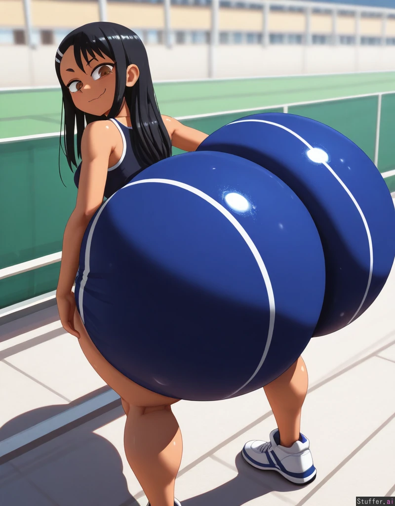(((perfect detail))), (((high rating))), (sophisticated detail), (highly detailed face), best_quality, vanripper_(style):1.2, (1girl), (solo), (1nagatoro), (tan_skin), hazel eyes, (tight black tank top), (tight navy blue gym buruma), (white-black sneakers), slim_waist, small_breasts, thick_thighs, (wide_hips), (big_ass:3.4), (fat_ass), (standing), (looking_back), (from_behind, from_side), (presenting_hindquarters), mischievous smirk,