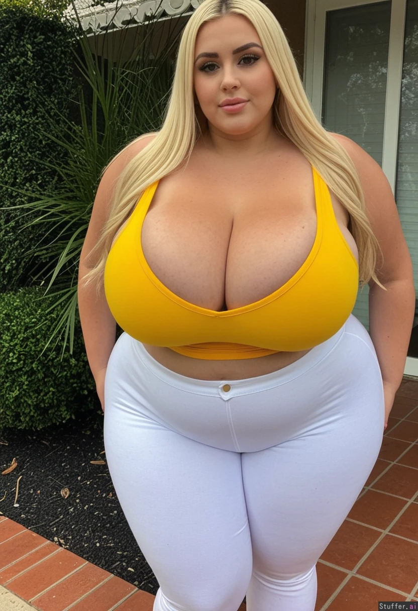 Tall tan woman Blue eyes Long blonde hair Large breasts cleavage showing (Perfect fit Yellow tank top) by White thong White high heels Standing outside (((((Hyper Massive cleavage showing))))) (((((Massive Enormous cleavage))))) (((((Gigantic cleavage))))) ((((Wide curvy hips)))) ((((Thick curvy hips)))) (((Weight gain))) ((Plump up)) ((Big round huge belly))