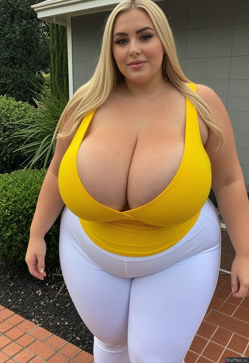 Tall tan woman Blue eyes Long blonde hair Large breasts cleavage showing (Perfect fit Yellow tank top) by White thong White high heels Standing outside ((((((Hyper Massive cleavage showing)))))) ((((((Hyper Massive Enormous cleavage)))))) (((((Gigantic cleavage))))) ((((Wide curvy hips)))) ((((Thick curvy hips)))) (((Weight gain))) (((Plump up))) (((Big round massive huge belly)))