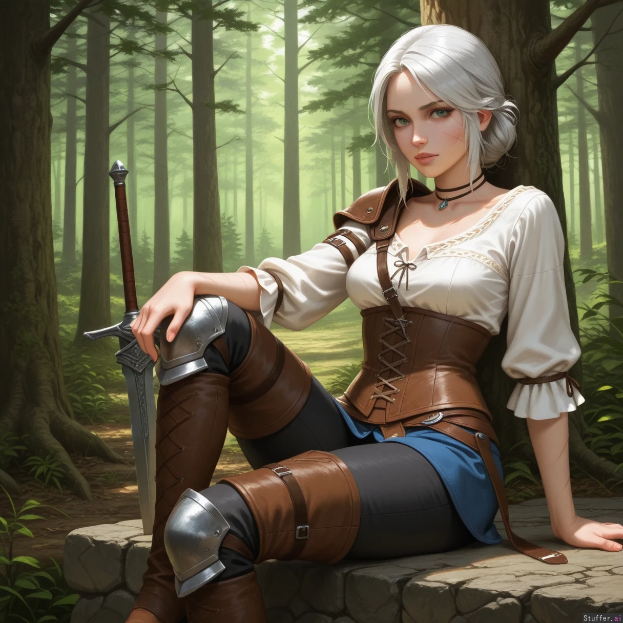 high detail , high res , classical oil painting , medieval setting , realistic , solo , ciri witcher 3 , dark green eyes , full lips , white hair , horizontal scar on left cheek , white blouse , long dark grey hosen , laced corset , knee high boots , simple outfit , long silver sword , boreal forest , , thick athletic body , ,