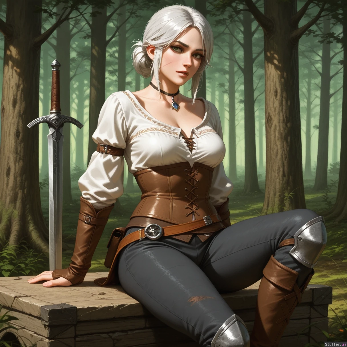 high detail , high res , classical oil painting , medieval setting , realistic , solo , ciri witcher 3 , dark green eyes , full lips , white hair , horizontal scar on left cheek , white blouse , long dark grey hosen , laced corset , knee high boots , simple outfit , long silver sword , boreal forest , , thick athletic body , thick muscles ,