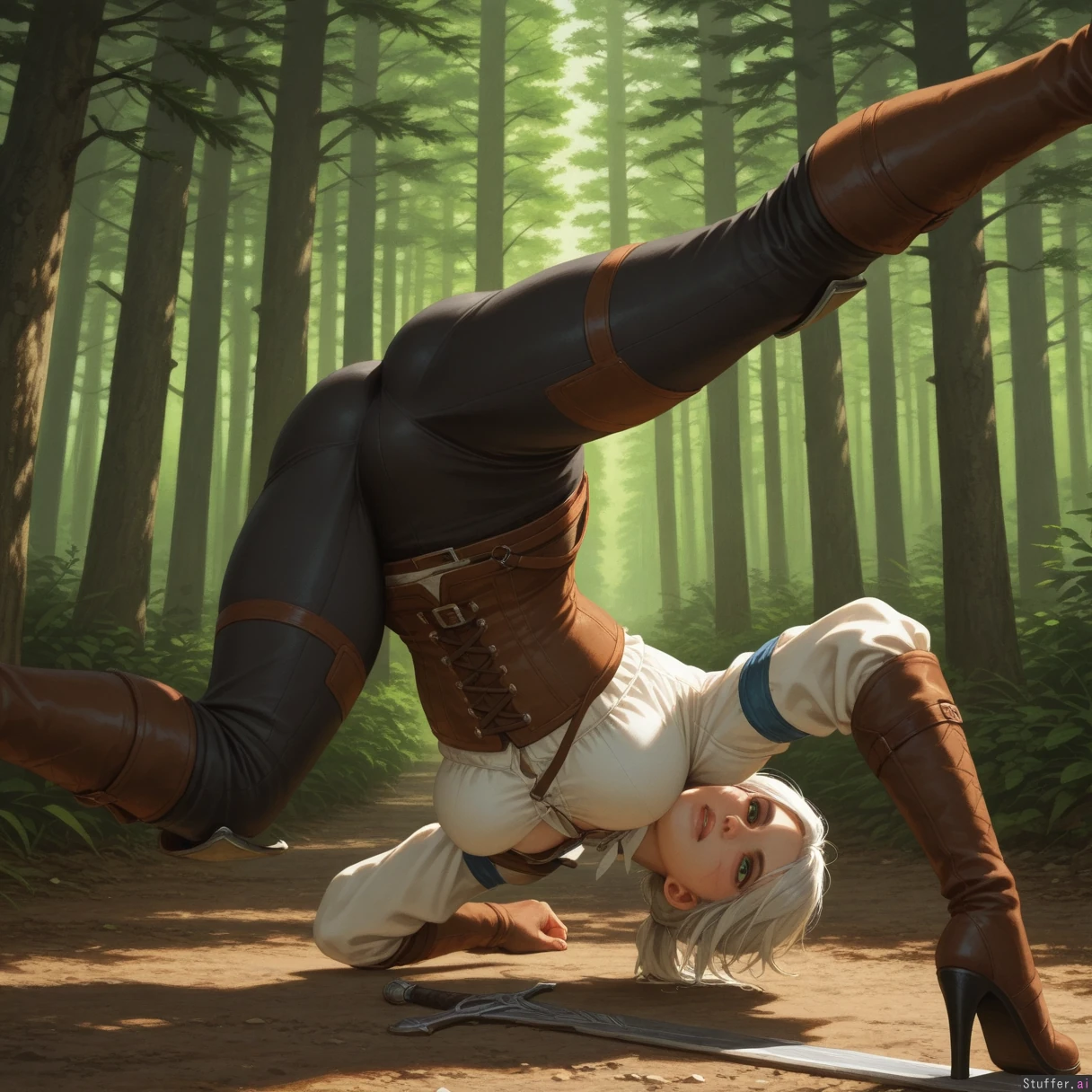 high detail , high res , classical oil painting , medieval setting , realistic , solo , ciri witcher 3 , dark green eyes , full lips , white hair , horizontal scar on left cheek , mature face , white blouse , long dark grey hosen , laced corset , knee high boots , simple outfit , long silver sword , boreal forest , acrobat , focused , rear view , thick athletic body , plump muscles , thick waist ,