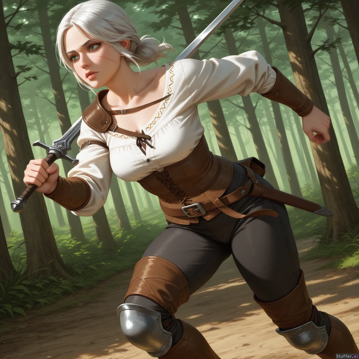high detail , high res , classical oil painting , medieval setting , realistic , solo , ciri witcher 3 , dark green eyes , full lips , white hair , horizontal scar on left cheek , mature face , white blouse , long dark grey hosen , laced corset , knee high boots , simple outfit , long silver sword , boreal forest , running , focused , , thick athletic body , plump muscles , thick waist ,