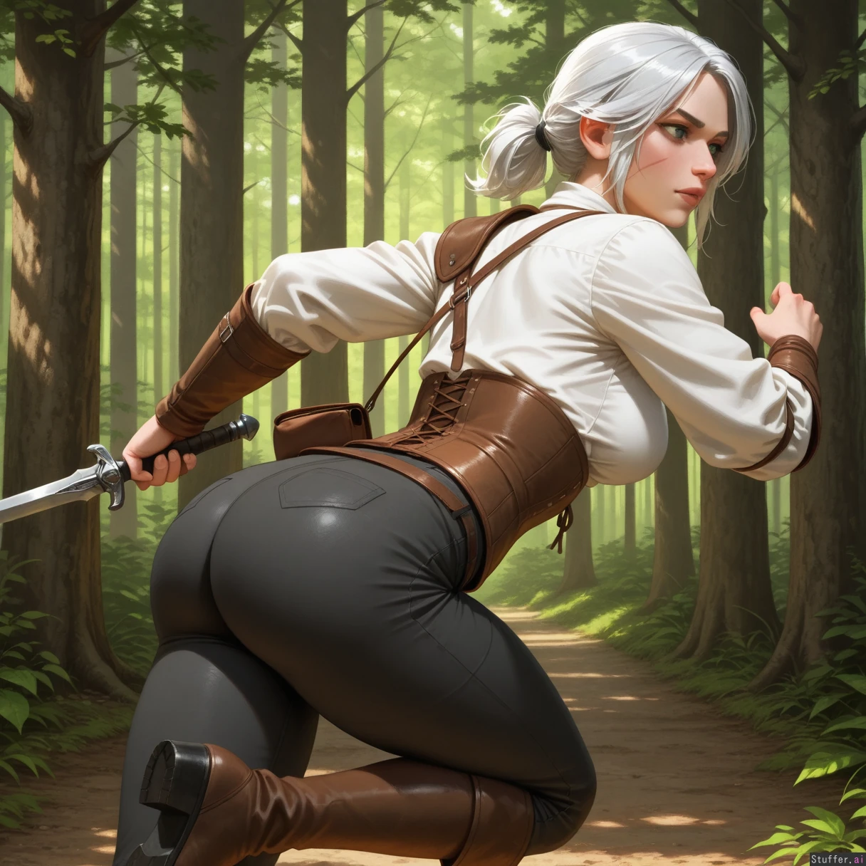 high detail , high res , classical oil painting , medieval setting , realistic , solo , ciri witcher 3 , dark green eyes , full lips , white hair , horizontal scar on left cheek , mature face , white blouse , long dark grey hosen , laced corset , knee high boots , simple outfit , long silver sword , boreal forest , running , focused , ass view , thick athletic body , plump muscles , thick waist ,