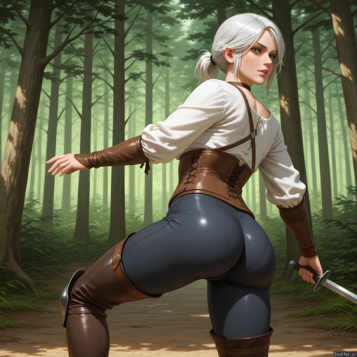 high detail , high res , classical oil painting , medieval setting , realistic , solo , ciri witcher 3 , dark green eyes , full lips , white hair , horizontal scar on left cheek , mature face , white blouse , long dark grey hosen , laced corset , knee high boots , simple outfit , long silver sword , boreal forest , fencing , focused , ass view , thick athletic body , plump muscles , thick waist ,