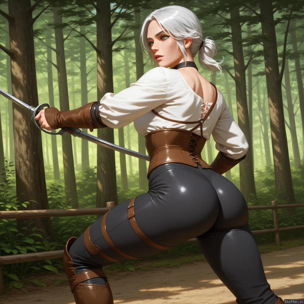 high detail , high res , classical oil painting , medieval setting , realistic , solo , ciri witcher 3 , dark green eyes , full lips , white hair , horizontal scar on left cheek , mature face , white blouse , long dark grey hosen , laced corset , knee high boots , simple outfit , long silver sword , boreal forest , fencing , focused , ass view , thick athletic body , plump muscles , thick waist ,