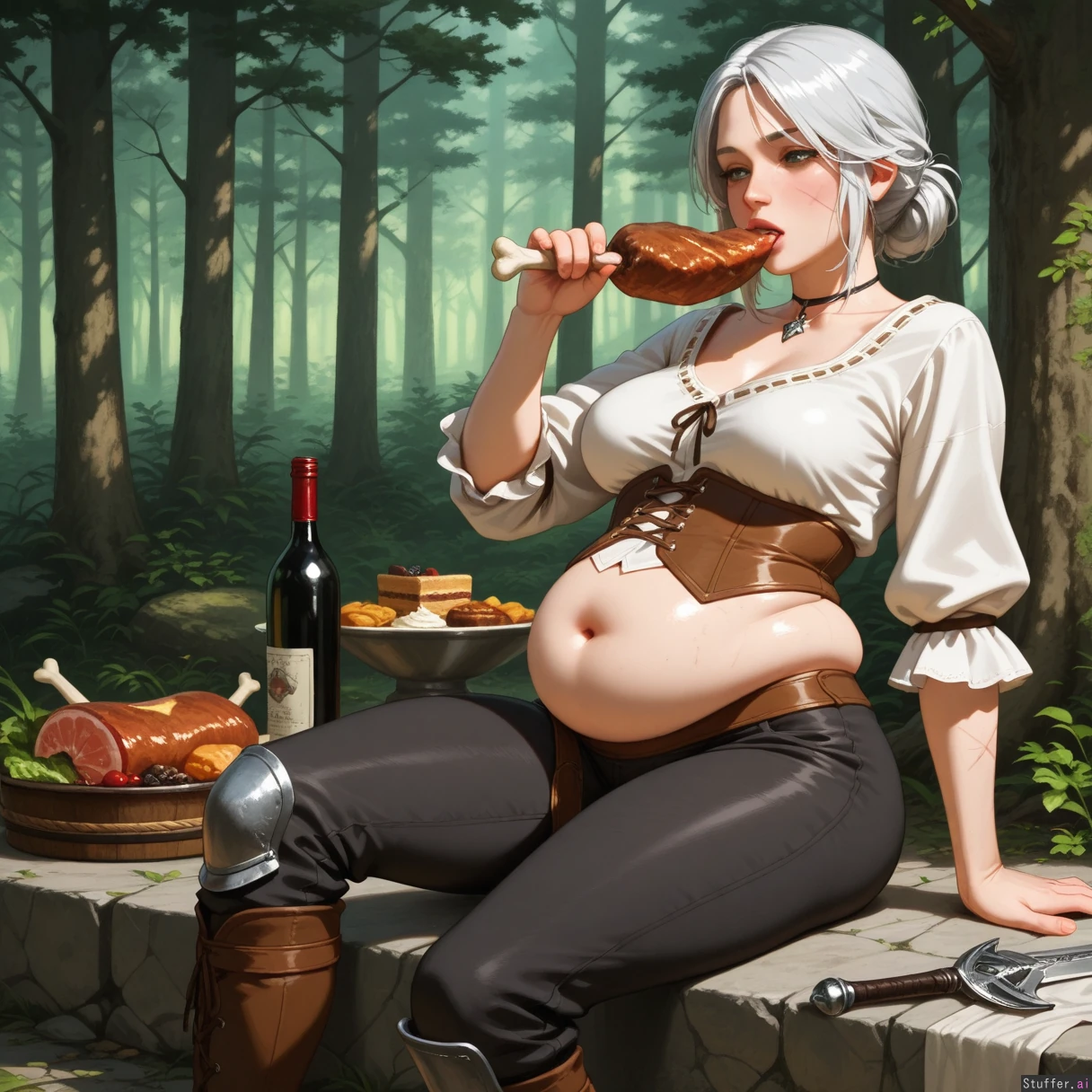 high detail , high res , classical oil painting , medieval setting , realistic , solo , ciri witcher 3 , dark green eyes , full lips , white hair , horizontal scar on left cheek , mature face , white blouse , long dark grey hosen , laced corset , knee high boots , simple outfit , long silver sword , boreal forest , sitting on a rock , focused , ass view , hearty meal , large roasted meat , cake , large wine bottle , large serving size , gluttony , eating , drunk , thick athletic body , plump muscles , thick waist , ( stuffed belly : 1.2)