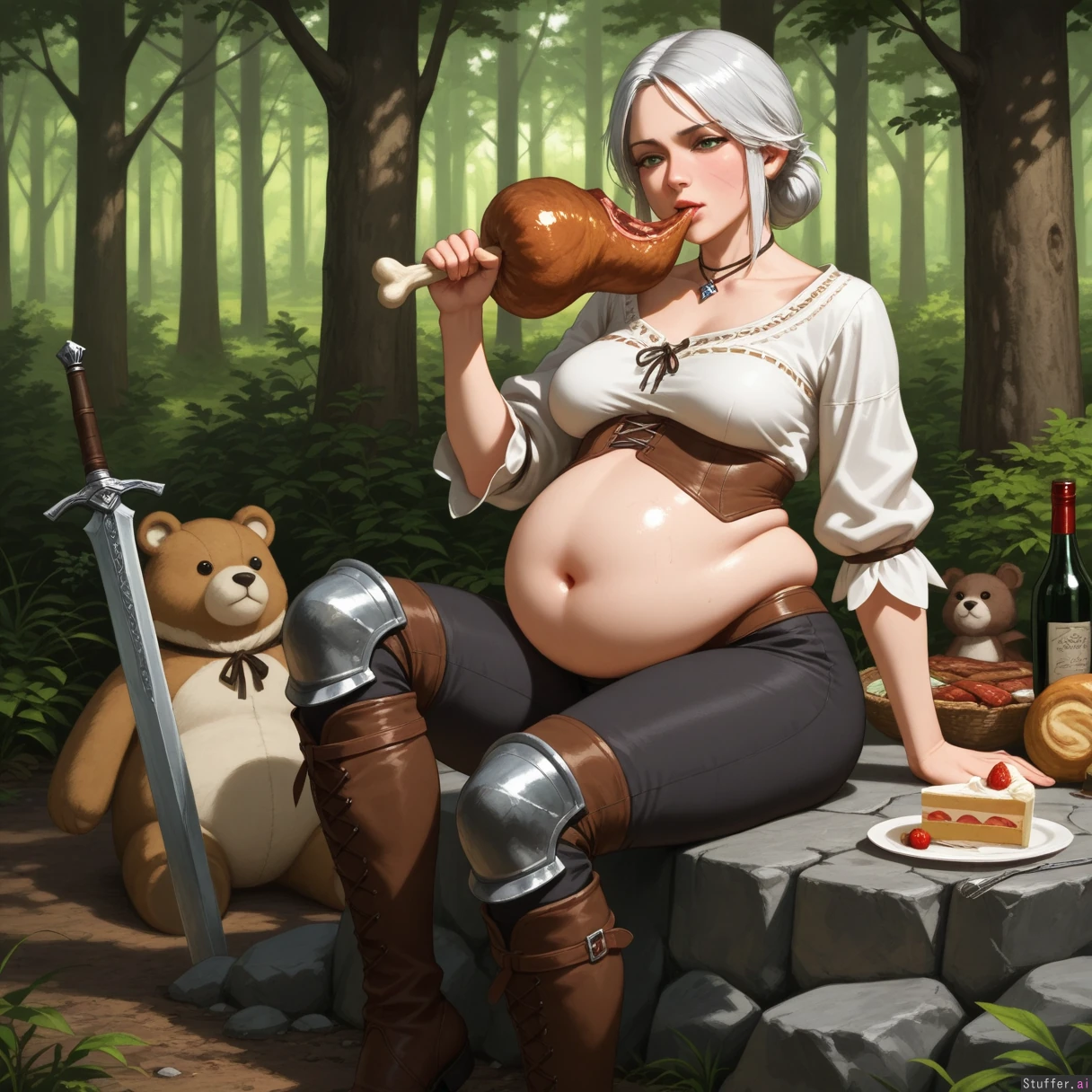 high detail , high res , classical oil painting , medieval setting , realistic , solo , ciri witcher 3 , dark green eyes , full lips , white hair , horizontal scar on left cheek , mature face , white blouse , long dark grey hosen , laced corset , knee high boots , simple outfit , long silver sword , boreal forest , sitting on a rock , focused , ass view , hearty meal , large roasted meat , cake , large wine bottle , large serving size , gluttony , eating , drunk , thick athletic body , plump muscles , thick waist , ( stuffed belly : 1.4)