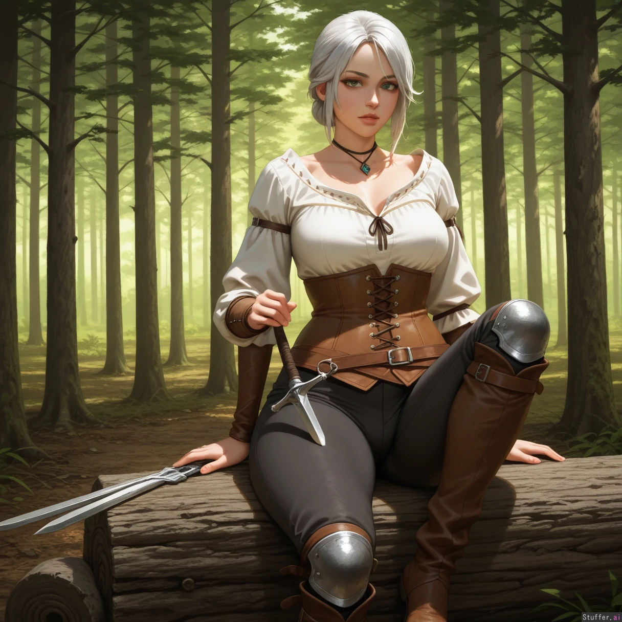 high detail , high res , classical oil painting , medieval setting , realistic , solo , ciri witcher 3 , dark green eyes , full lips , white hair , horizontal scar on left cheek , mature face , white blouse , long dark grey hosen , laced corset , knee high boots , simple outfit , long silver sword , boreal forest , , heavy athletic body , big plump muscles , thick waist , potbelly , thick hips ,