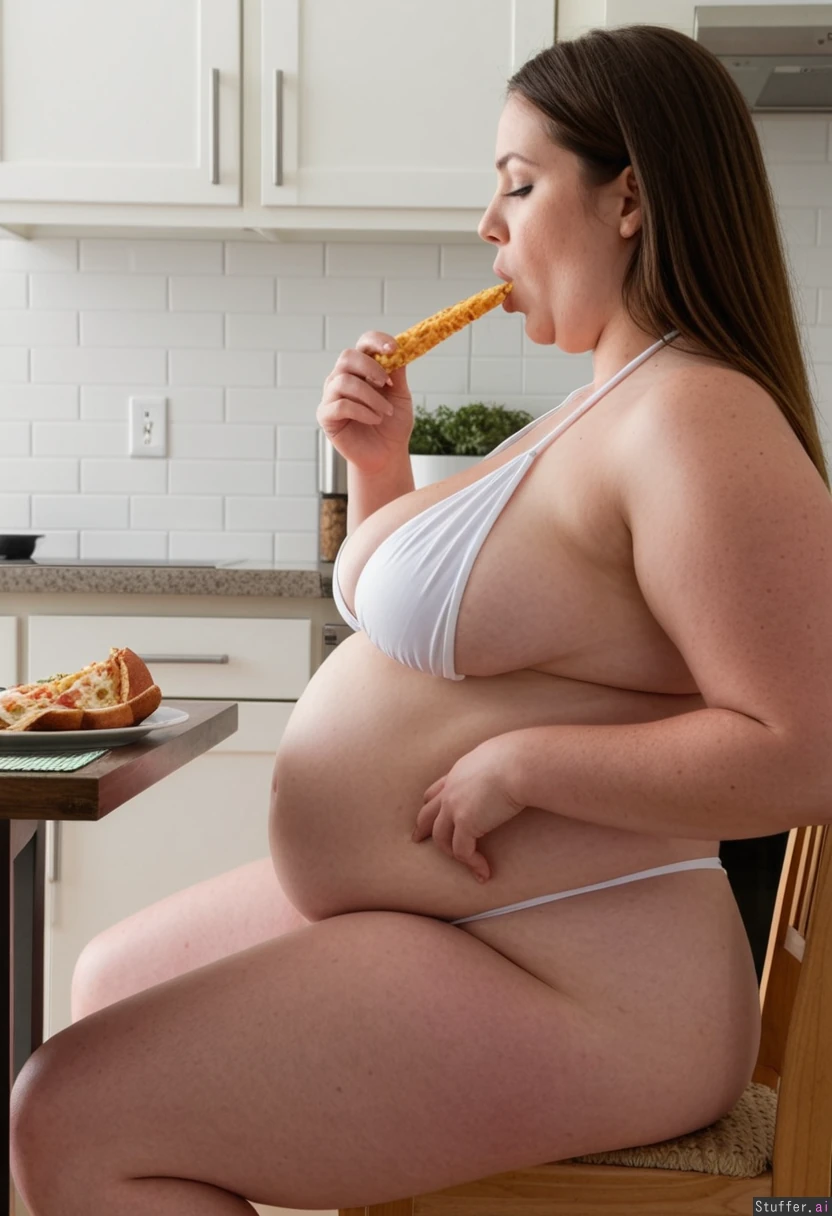 (Side view) Skinny woman sitting at kitchen table eating a lot of food Wearing white bikini Big weight gain Growing belly Thick hips Large breasts