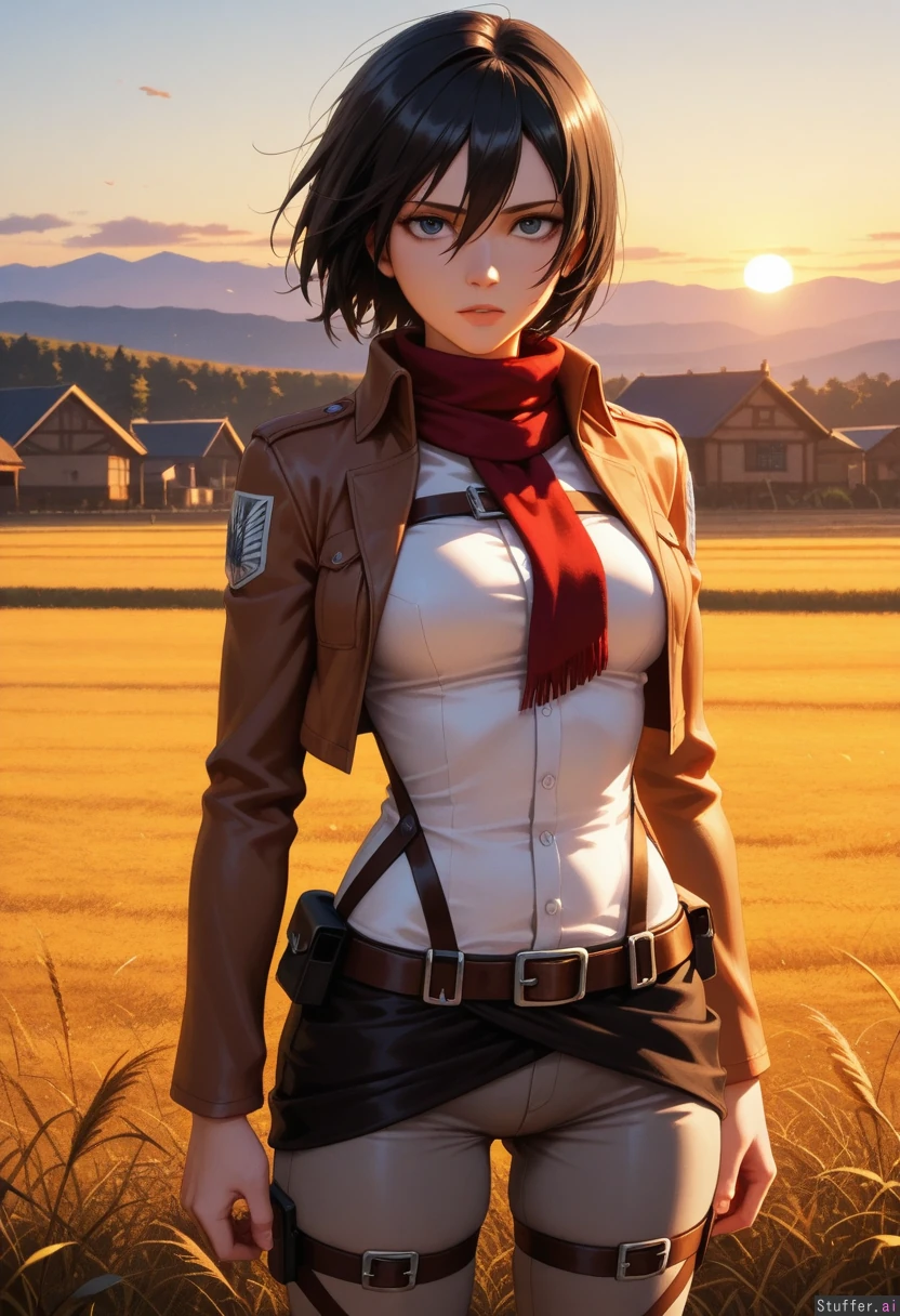 high res , high detail , oil painting , mikasa ackerman , full lips , grey eyes , black hair , mature face , serious expression , dark grey tights , simple white blouse , tactical belt , brown cropped jacket , sunset , golden hour lighting , field , village , slim athletic body , narrow waist , narrow hips ,