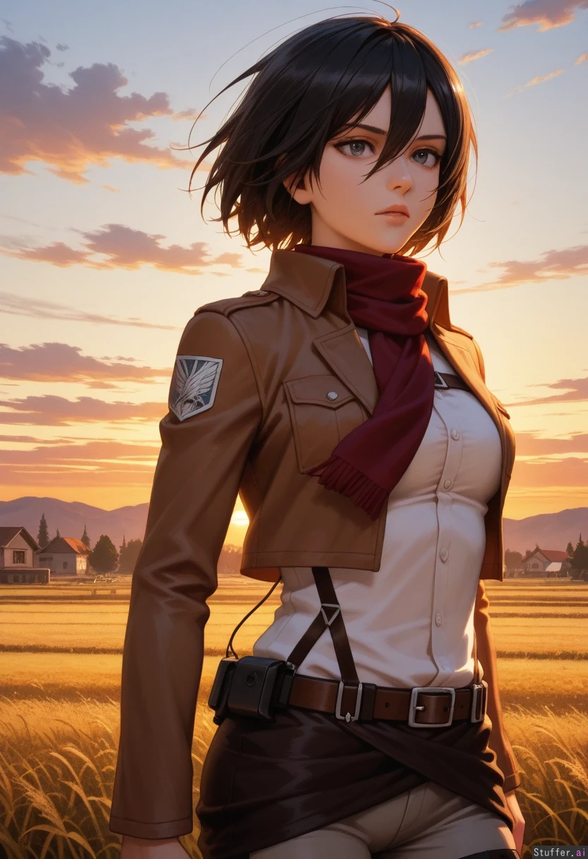 high res , high detail , oil painting , mikasa ackerman , full lips , grey eyes , black hair , mature face , serious expression , dark grey tights , simple white blouse , tactical belt , brown cropped jacket , sunset , golden hour lighting , field , village , stocky athletic body , , ,