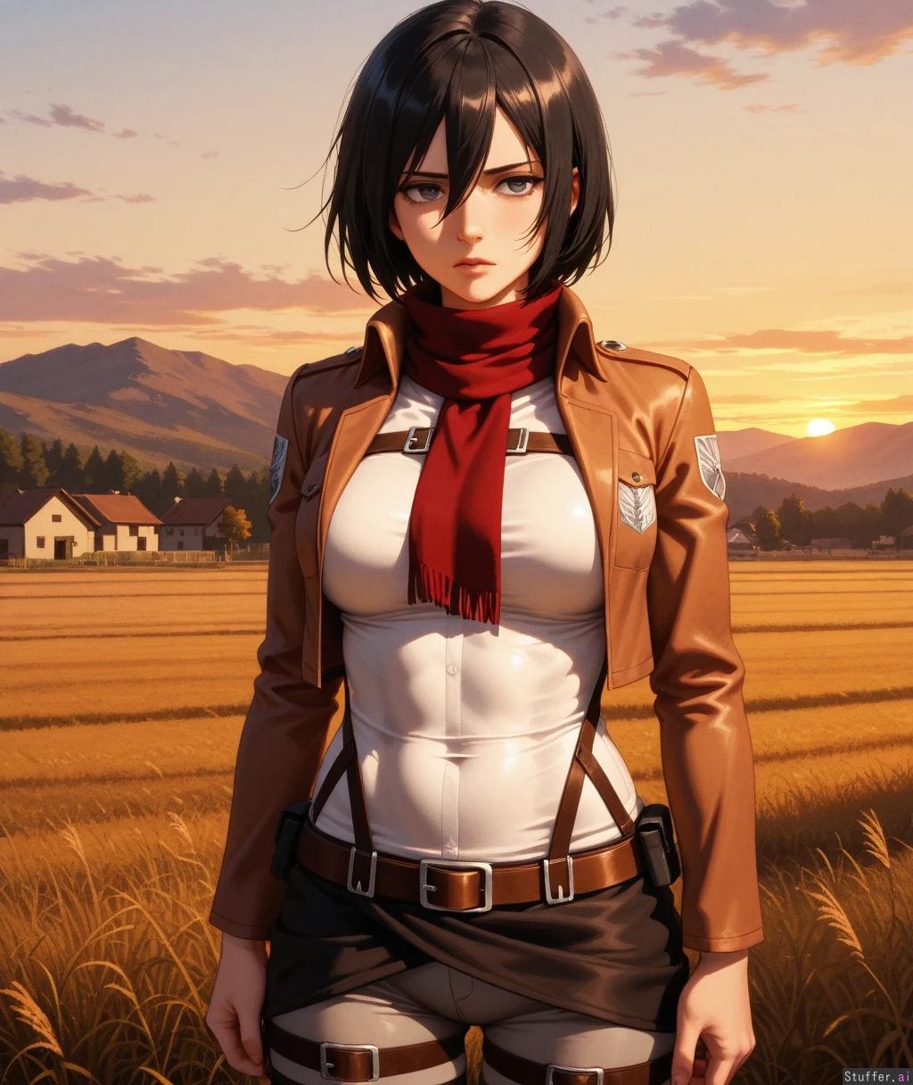 high res , high detail , oil painting , mikasa ackerman , full lips , grey eyes , black hair , mature face , serious expression , dark grey tights , simple white blouse , tactical belt , brown cropped jacket , sunset , golden hour lighting , field , village , thick athletic body , abs , athletic weight gain , ,