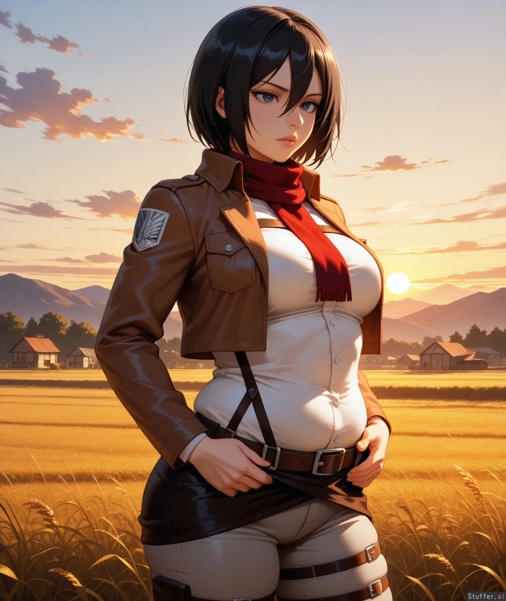 high res , high detail , oil painting , mikasa ackerman , full lips , grey eyes , black hair , mature face , serious feminine expression , dark grey tights , simple white blouse tucked in , tactical belt , brown cropped jacket , body outline , sunset , golden hour lighting , field , village , thick athletic body , abs , athletic weight gain , plump muscles , (potbelly:1.1) ,
