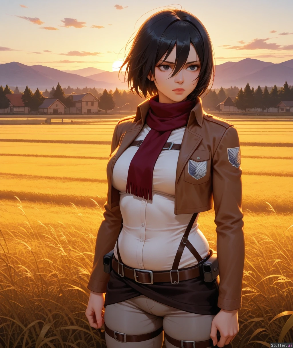 high res , high detail , oil painting , mikasa ackerman , full lips , grey eyes , black hair , mature face , serious feminine expression , dark grey tights , simple white blouse tucked in , tactical belt , brown cropped jacket , body outline , sunset , golden hour lighting , field , village , thick athletic body , abs , athletic weight gain , plump muscles , (potbelly:1.2) ,
