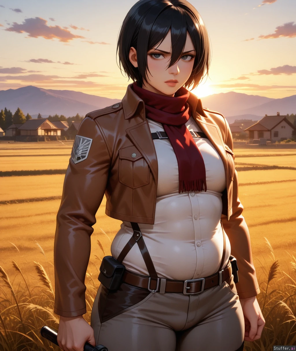 high res , high detail , oil painting , 30 year old mikasa ackerman , full lips , grey eyes , black hair , mature face , serious feminine expression , narrow shoulders , dark grey tights , simple white blouse tucked in , tactical belt , brown cropped jacket , body outline , sunset , golden hour lighting , field , village , thick athletic body , abs , athletic weight gain , plump muscles , (potbelly:1.3) ,