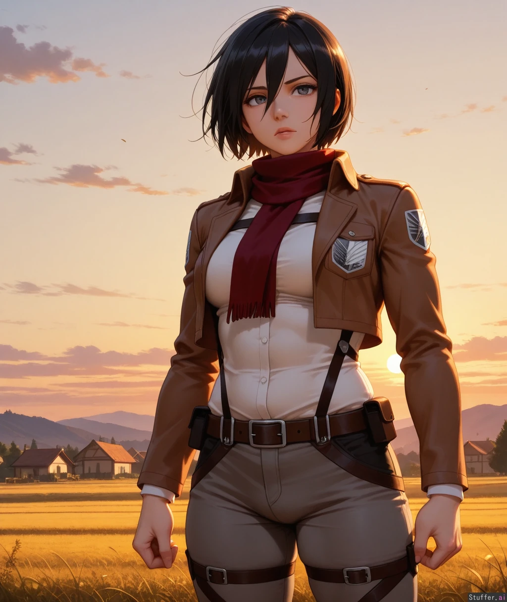 high res , high detail , oil painting , 30 year old mikasa ackerman , full lips , grey eyes , black hair , mature face , serious feminine expression , narrow shoulders , dark grey tights , simple white blouse tucked in , tactical belt , brown cropped jacket , body outline , sunset , golden hour lighting , field , village , thick athletic body , doughy abs , athletic weight gain , plump muscles , (potbelly) ,