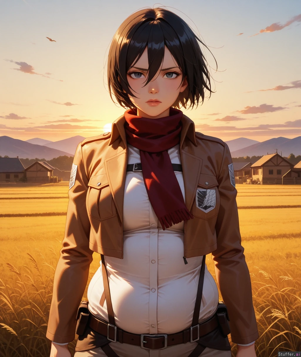 high res , high detail , oil painting , 30 year old mikasa ackerman , full lips , grey eyes , black hair , mature face , serious feminine expression , narrow shoulders , dark grey tights , simple white blouse tucked in , tactical belt , brown cropped jacket , body outline , sunset , golden hour lighting , field , village , thick athletic body , , buxom weight gain , plump muscles , (potbelly) ,