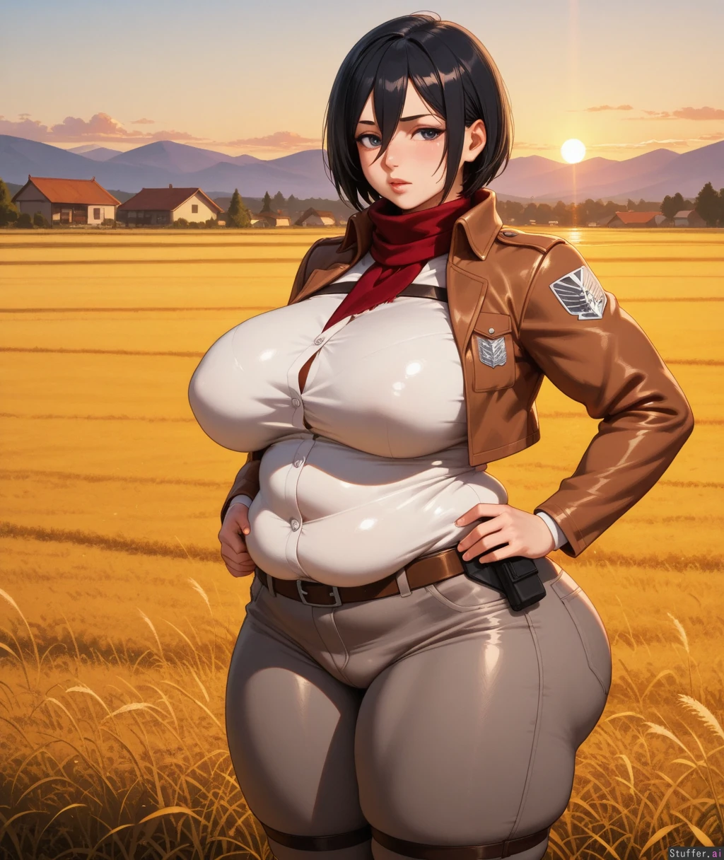 high res , high detail , oil painting , 30 year old mikasa ackerman , full lips , grey eyes , black hair , mature face , lazy feminine expression , narrow shoulders , dark grey tights , simple white blouse tucked in , tactical belt , brown cropped jacket , body outline , sunset , golden hour lighting , field , village , thick athletic body , round plump thighs , milf , thick weight gain , massive plump muscles , ( sagging potbelly) , plump heavy breasts , round plump ass , plump arms , plump cheeks , plump jaw line , chubby , fupa , huge ass ,
