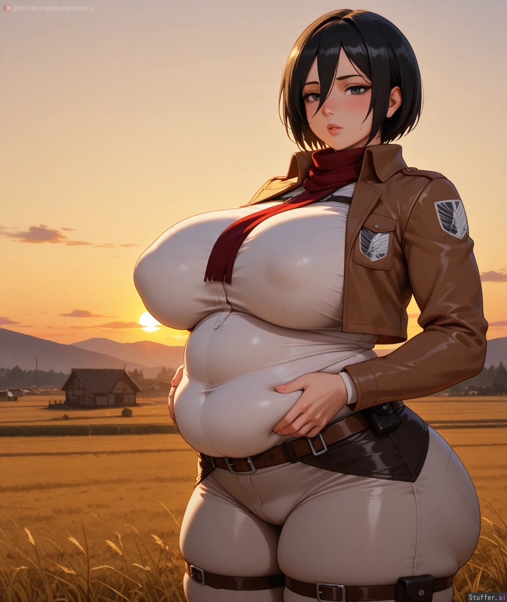 high res , high detail , oil painting , 30 year old mikasa ackerman , full lips , grey eyes , black hair , mature face , lazy feminine expression , narrow shoulders , dark grey tights , simple white blouse tucked in , tactical belt , brown cropped jacket , body outline , sunset , golden hour lighting , field , village , thick athletic body , round plump thighs , milf , thick weight gain , massive plump muscles , ( sagging potbelly) , plump heavy breasts , round plump ass , plump arms , plump cheeks , plump jaw line , heavy chubby , fupa , huge ass ,