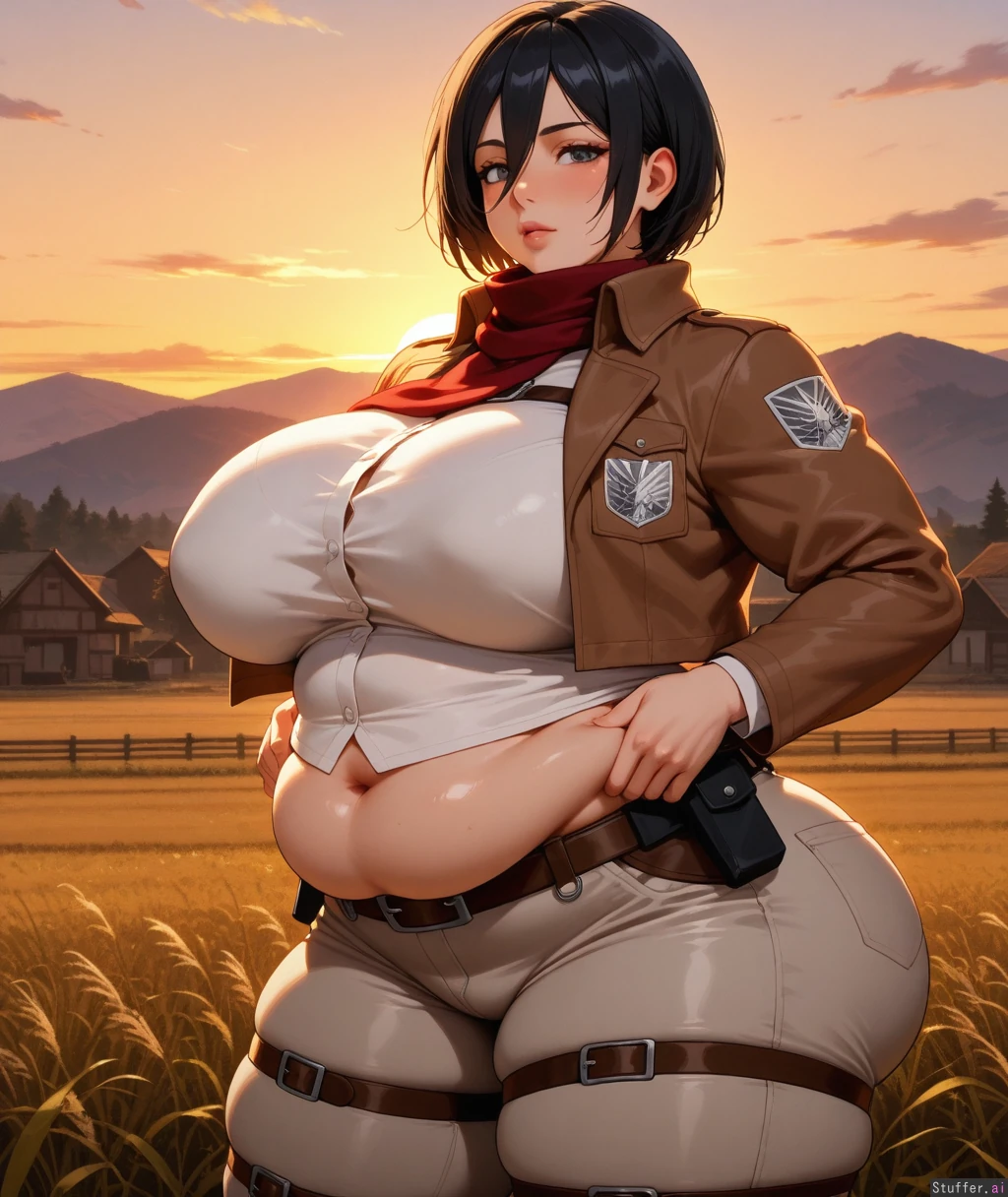 high res , high detail , oil painting , 30 year old mikasa ackerman , full lips , grey eyes , black hair , mature face , lazy feminine expression , narrow shoulders , dark grey tights , simple white blouse tucked in , tactical belt , brown cropped jacket , body outline , sunset , golden hour lighting , field , village , bbw athletic body , big thick thighs , buxom milf , thick weight gain , big round muscles , ( sagging potbelly) , plump heavy breasts , big thick ass , plump arms , plump cheeks , heavy jaw line , chunky , sagging fupa , thick side rolls , plump jowls ,