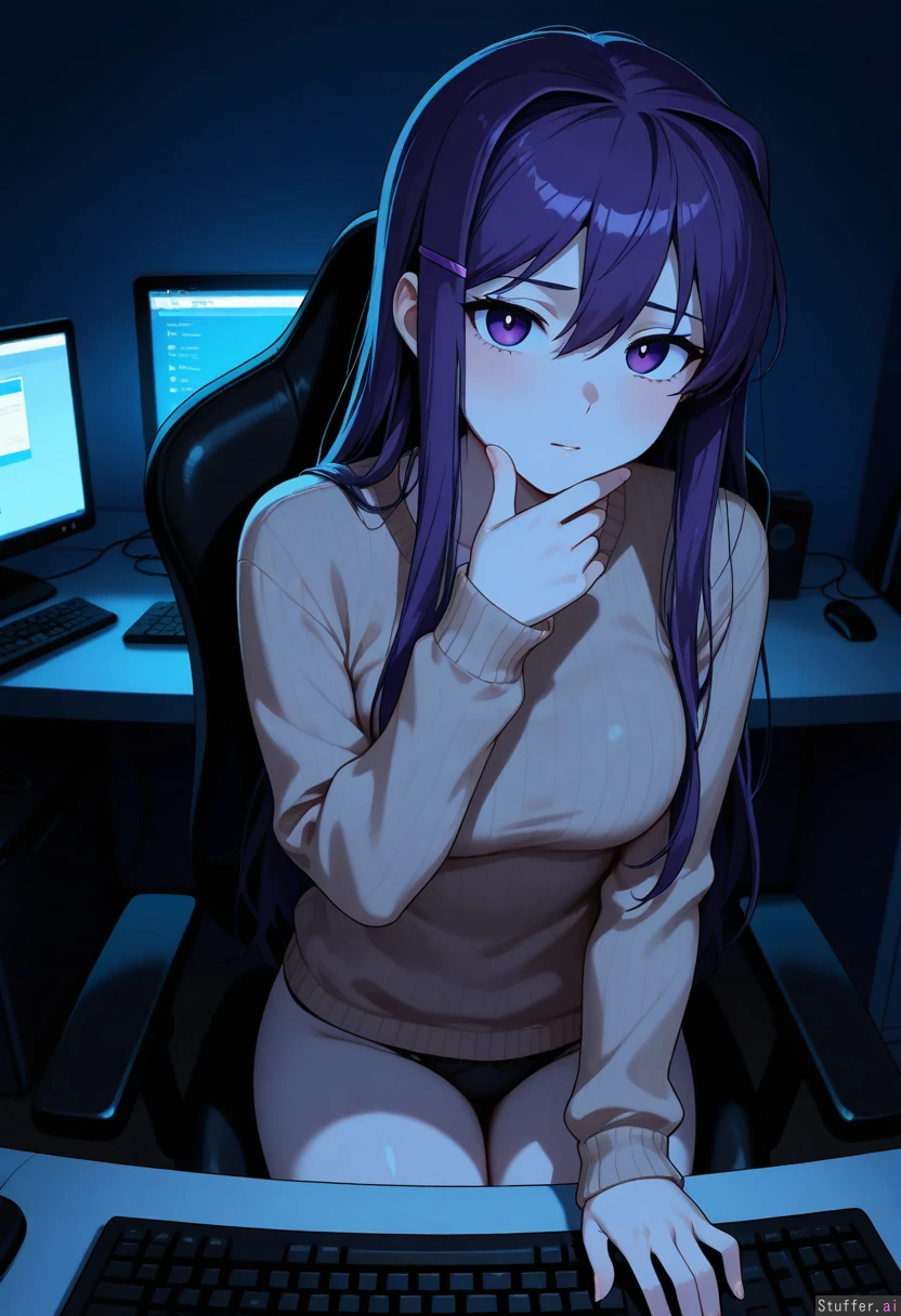 Solo, yuri_(doki_doki_literature_club), pale skin, dark lighting, bedroom, blue lighting, hand on keyboard, looking at viewer, one hand on chin, tan long sleeve sweater, black panties, plain bedroom, plain computer chair