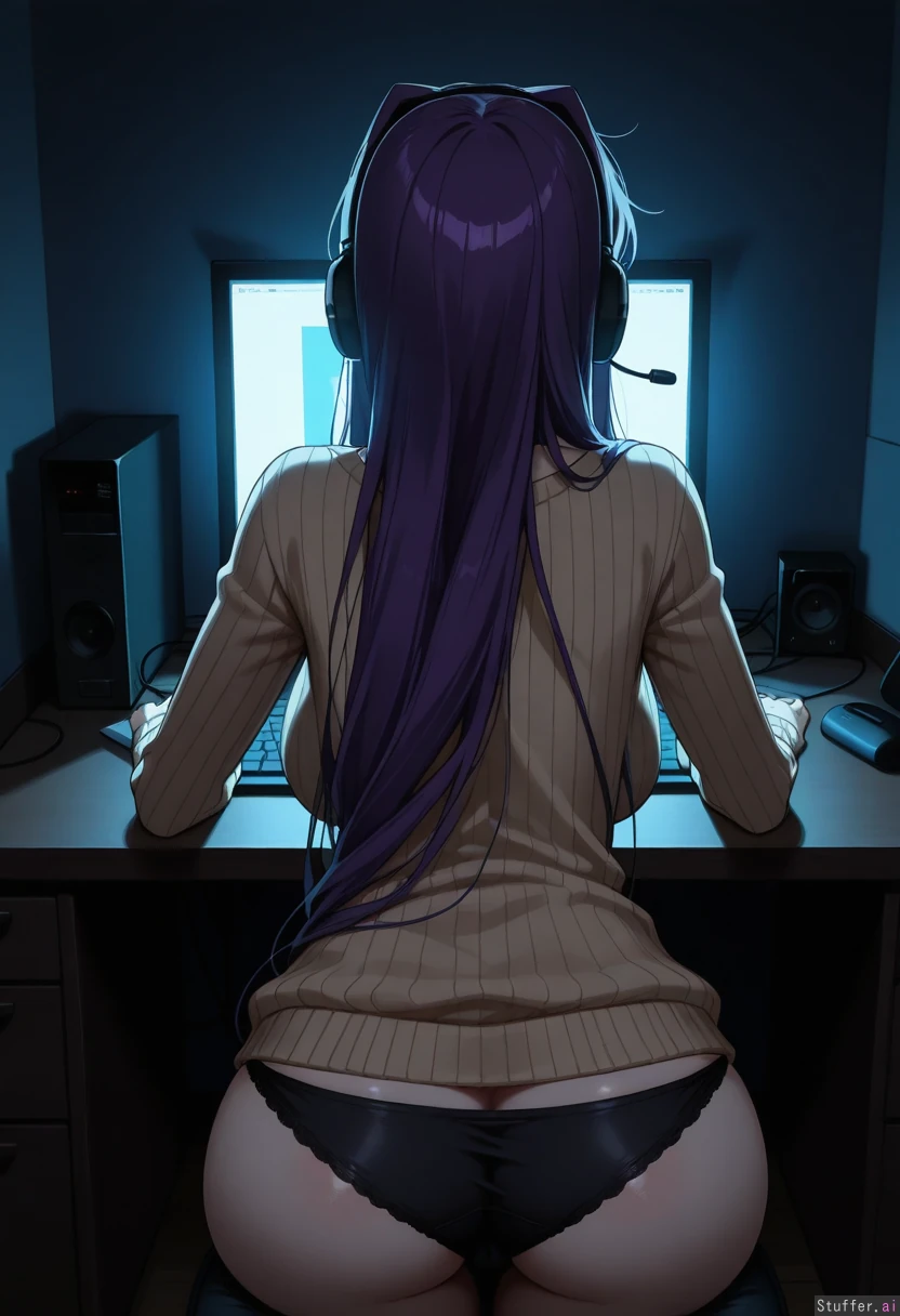 Solo, yuri_(doki_doki_literature_club), pale skin, dark lighting, large breasts, plain bedroom, blue lighting, tan long sleeve sweater, black panties, plain bedroom, plain computer chair, back view, blushing, headset, shadowed face, horror, creepy, unsettling, yandere, reaching into computer monitor portal