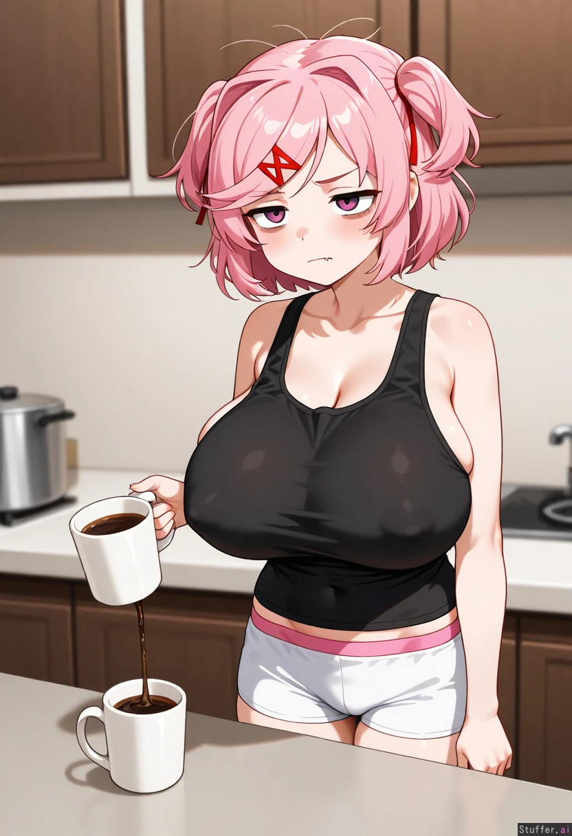 Solo, natsuki_(doki_doki_literature_club), black tank top, messy hair, huge bags under eyes, tired, eye bags, fang, grumpy, staring, small pupils, disheveled, white athletic shorts, nipple outline, pink panties, pouring coffee into a mug, kitchen