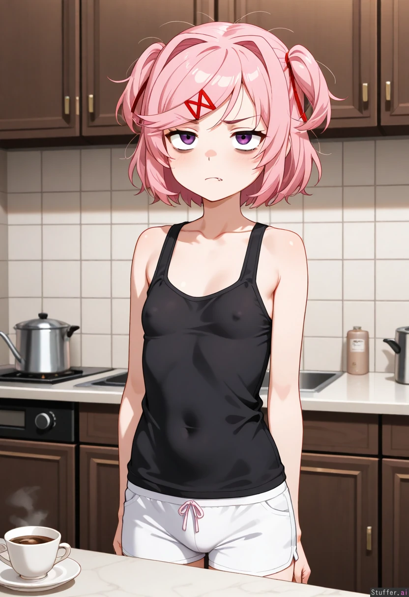 Solo, natsuki_(doki_doki_literature_club), black tank top, messy hair, huge bags under eyes, tired, eye bags, fang, grumpy, staring, small pupils, disheveled, white athletic shorts, nipple outline, pink panties, coffee, small breasts, flatchest, kitchen, short