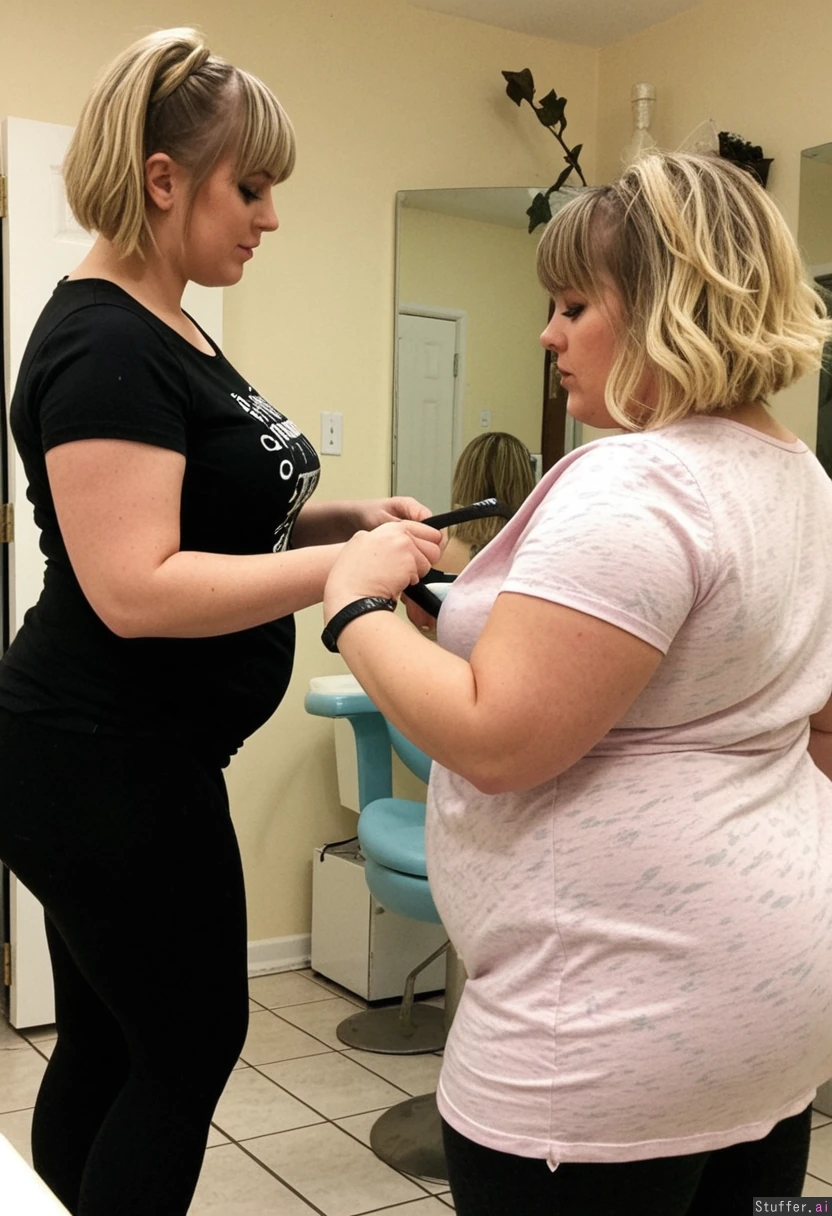 1) A panned out, profile view of a (petite-plus-size:1.6) hairdresser (brunette, short hair, messy, bangs, black leggings, black t shirt) cutting the hair of 2) a (cute:1.9)(curvy:1.5) chubby blonde (pastel dress) in a shabby-chic salon, (no text_on_clothing)