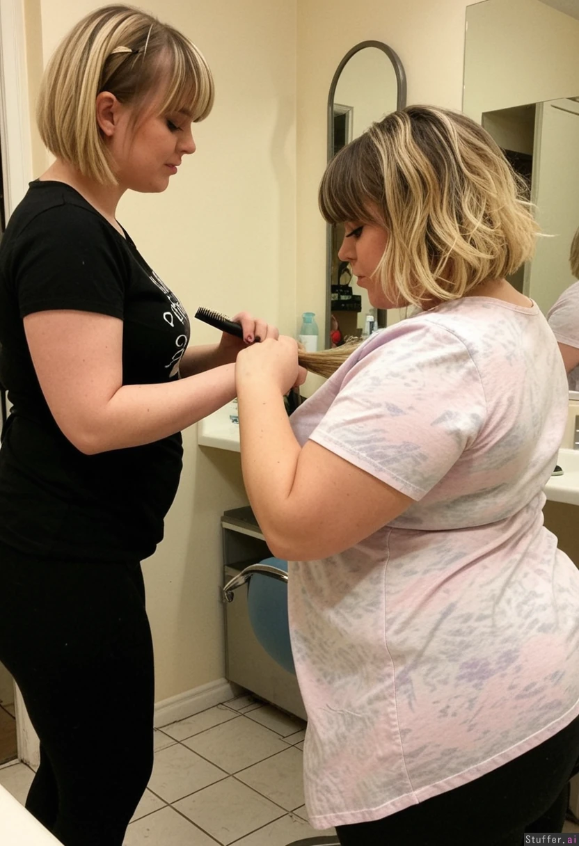1) A panned out, profile view of a (petite-plus-size:1.6) hairdresser (brunette, short hair, messy, bangs, black leggings, black t shirt) cutting the hair of 2) a (cute:1.9)(soft:1.5) chubby blonde (pastel dress) in a shabby-chic salon, (no text_on_clothing)