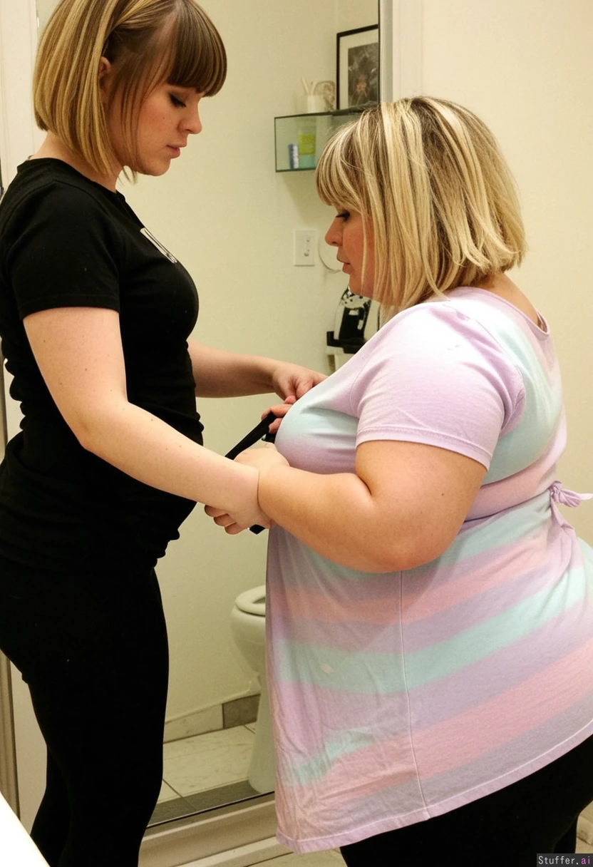 1) A panned out, profile view of a (petite-plus-size:1.6)(thick_bottom:1.5) hairdresser (brunette, short hair, messy, bangs, black leggings, black t shirt) cutting the hair of 2) a (cute:1.9)(fattened:1.2) chubby blonde (pastel dress) in a shabby-chic salon, (no text_on_clothing)